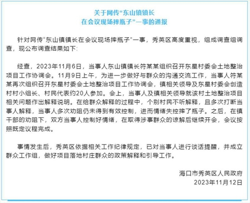 ·??谛阌^(qū)通報“東山鎮(zhèn)鎮(zhèn)長在會議現(xiàn)場摔瓶子”:已對當(dāng)事人進行談話提醒。