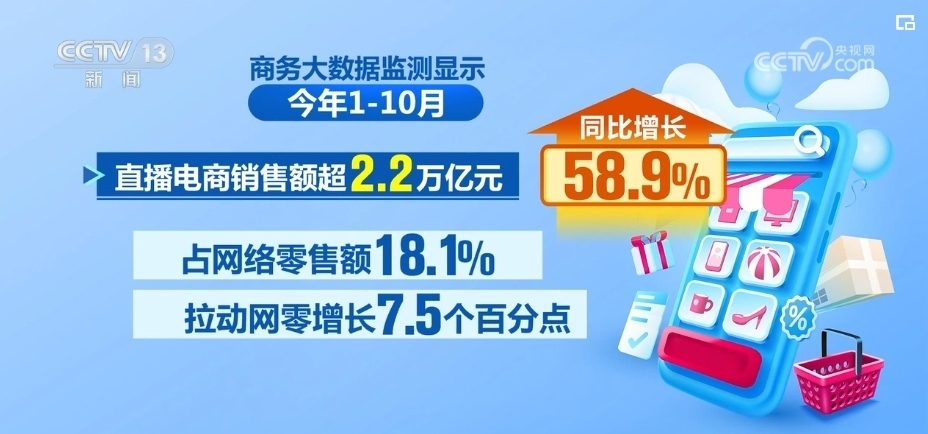 商務(wù)大數(shù)據(jù)監(jiān)測(cè)顯示,2023年1—10月份,直播電商銷售額超2.2萬億元,同比增長58.9%,占網(wǎng)絡(luò)零售額18.1%,拉動(dòng)網(wǎng)零增長7.5個(gè)百分點(diǎn)。其中,中秋、國慶期間,住宿、旅游、文娛和餐飲日均在線銷售額同比分別增長133.7%、123.1%、82.1%和19.7%。