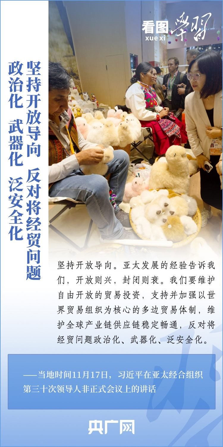 當(dāng)?shù)貢r間11月17日上午,亞太經(jīng)合組織第三十次領(lǐng)導(dǎo)人非正式會議在美國舊金山舉行。國家主席習(xí)近平出席會議并發(fā)表題為《堅守初心 團(tuán)結(jié)合作 攜手共促亞太高質(zhì)量增長》的重要講話。習(xí)主席在講話中全面闡述了中國對深化亞太合作、促進(jìn)地區(qū)和世界經(jīng)濟(jì)增長的重要主張,以“四個堅持”提出多項務(wù)實舉措,希望同各方一道努力,共同打造亞太下一個“黃金三十年”。一起來學(xué)習(xí)!