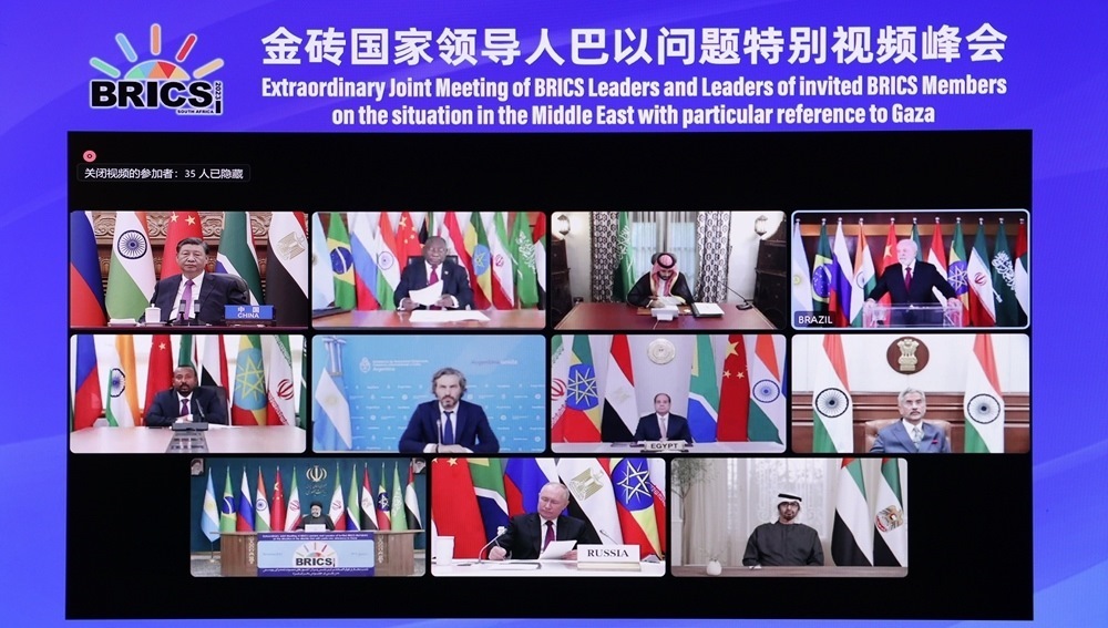 “當(dāng)前形勢下,金磚國家就巴以問題發(fā)出正義之聲、和平之聲,非常及時(shí)、非常必要?!痹谥v話中,習(xí)近平主席開宗明義。