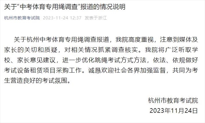 ·中考體育專用跳繩一根賣(mài)78元?杭州市教育考試院回應(yīng):抓緊調(diào)查核實(shí)。