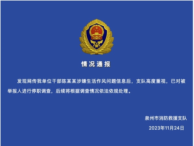 ·官方通報(bào)消防科長(zhǎng)被舉報(bào)婚內(nèi)出軌:已停職調(diào)查。