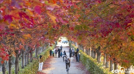 2023年11月24日,蘇州工業(yè)園區(qū)陽(yáng)澄湖半島莆田有機(jī)農(nóng)業(yè)園紅楓大道上的紅葉燦爛如霞,已到最佳觀賞期,吸引游客前來(lái)賞楓。