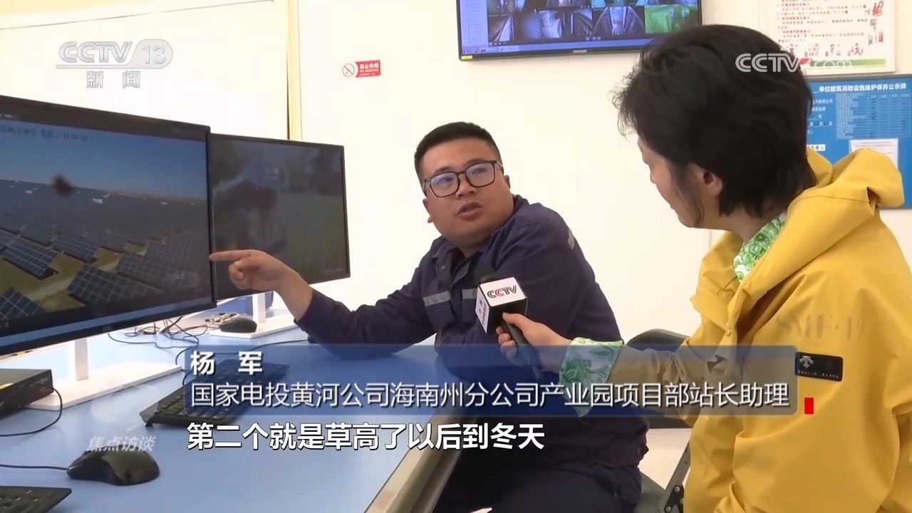 國家電投黃河公司海南州分公司產(chǎn)業(yè)園項目部站長助理楊軍:“光伏板下面這些羊,就是我們請過來幫忙除草的。因為每年一到夏天,園區(qū)電池組件下面草就特別高,長高了以后會遮擋電池組件,一個是影響發(fā)電效率,再一個秋冬季有火災(zāi)隱患?!?/p>