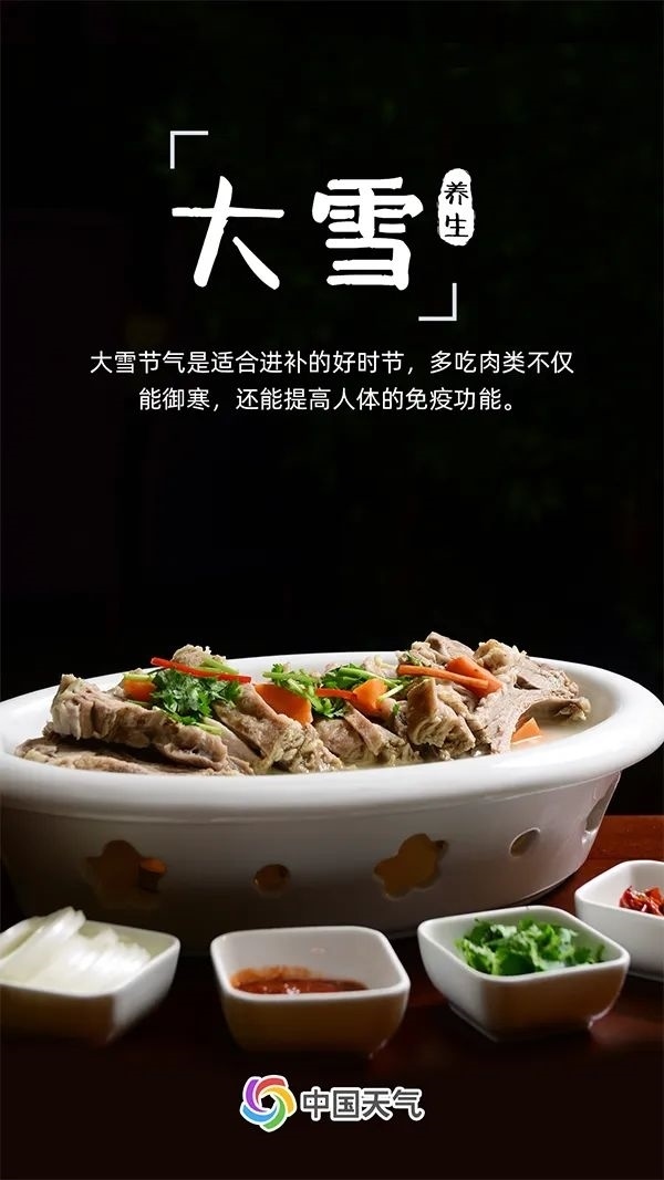 大雪也是適合進(jìn)補(bǔ)的好時(shí)節(jié)。冬天的寒冷為放肆吃肉提供了充足的理由,肉類不僅能為我們的身體提供足夠的熱量以抵御嚴(yán)寒,還能提高人體的免疫功能,促進(jìn)新陳代謝。不過(guò),進(jìn)補(bǔ)也要有“度”,除了吃肉,也要適當(dāng)吃一些新鮮的水果和蔬菜,做到營(yíng)養(yǎng)均衡。