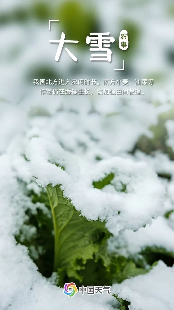 大雪時(shí)節(jié),我國(guó)北方地區(qū)冰天雪地,進(jìn)入農(nóng)閑時(shí)節(jié)。而南方小麥、油菜等作物仍在緩慢生長(zhǎng),需要加強(qiáng)田間管理。一旦遭受凍害,要及時(shí)松土增肥、蓄水提溫、加強(qiáng)中后期管理,力爭(zhēng)把凍害損失降到最低。