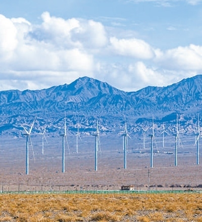 甘肅酒泉玉門(mén)市,廣袤戈壁上的風(fēng)機(jī)。