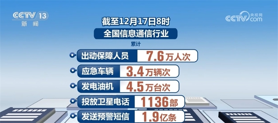 據(jù)了解,截至12月17日8時(shí),全國(guó)信息通信行業(yè)累計(jì)出動(dòng)保障人員7.6萬(wàn)人次、應(yīng)急車輛3.4萬(wàn)輛次、發(fā)電油機(jī)4.5萬(wàn)臺(tái)次、投放衛(wèi)星電話1136部、發(fā)送預(yù)警短信1.9億條。全國(guó)通信網(wǎng)絡(luò)整體運(yùn)行平穩(wěn),累計(jì)3053座基站退服,已修復(fù)2933座,未發(fā)生鄉(xiāng)鎮(zhèn)級(jí)通信全阻。