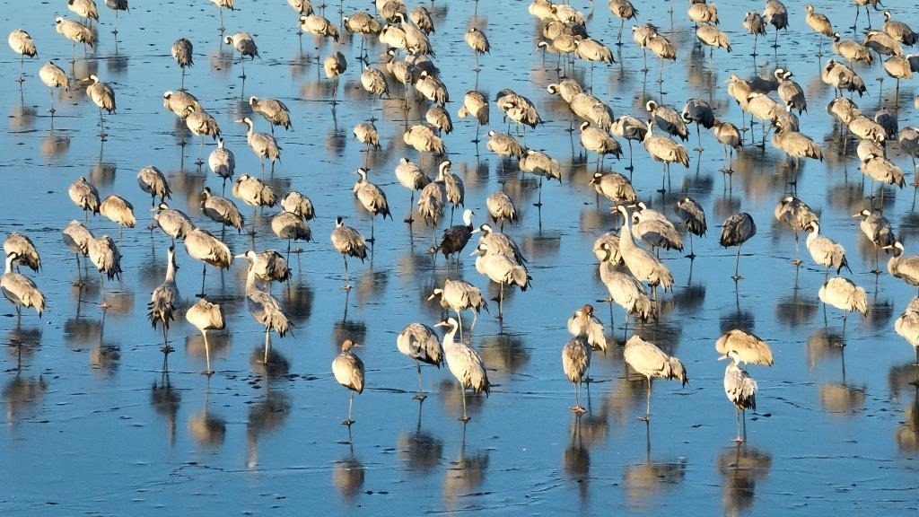 “12月初開始,鶴群陸續(xù)飛臨衡水湖。目前正處于候鳥越冬期,已有60余種、5萬余只候鳥飛到衡水湖越冬?!焙馑壹壸匀槐Wo區(qū)資源保護局濕地生態(tài)監(jiān)測科科長張余廣說。