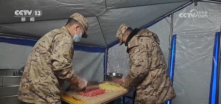在青海民和中川鄉(xiāng)草灘村美一小學(xué)安置點(diǎn),官兵們準(zhǔn)備食材和面剁餡,他們要在這個特殊的日子,讓受災(zāi)群眾吃上一碗熱騰騰的餃子。帳篷里,群眾和官兵分工協(xié)作,處處洋溢著“家”的溫馨。