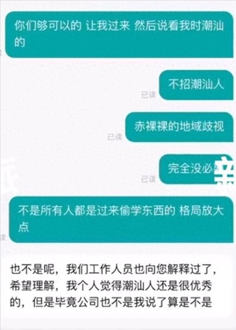 ·廣東深圳一男子求職因籍貫是潮汕直接被拒,工作人員稱“老板說潮汕人就會(huì)偷偷摸摸學(xué)東西”。