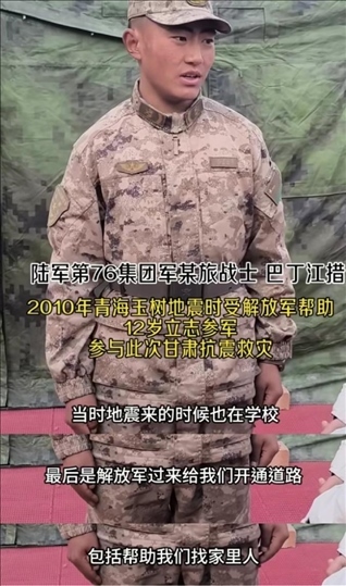 巴丁江措,第76集團(tuán)軍某旅戰(zhàn)士。2010年青海玉樹地震時(shí),解放軍幫他脫險(xiǎn)。如今,同樣成為解放軍的他奮戰(zhàn)在甘肅抗震救災(zāi)一線。他說:“我想對(duì)以前救我的人說,我?guī)椭烁嗳?,讓他們?yōu)槲因湴?!?/p>