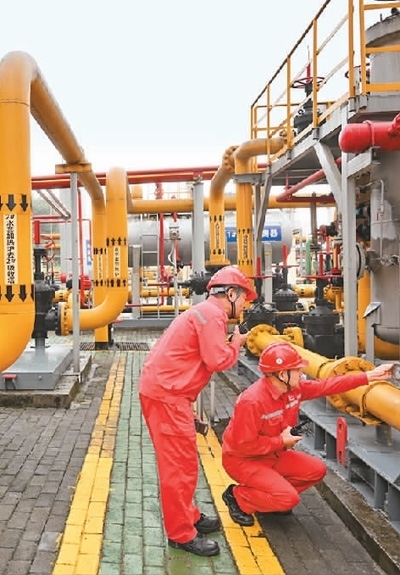 在位于重慶涪陵的中國(guó)首個(gè)投入商業(yè)開(kāi)發(fā)頁(yè)巖氣田——涪陵頁(yè)巖氣田白濤集輸站,技術(shù)人員對(duì)設(shè)備進(jìn)行巡檢。新華社記者 王全超攝