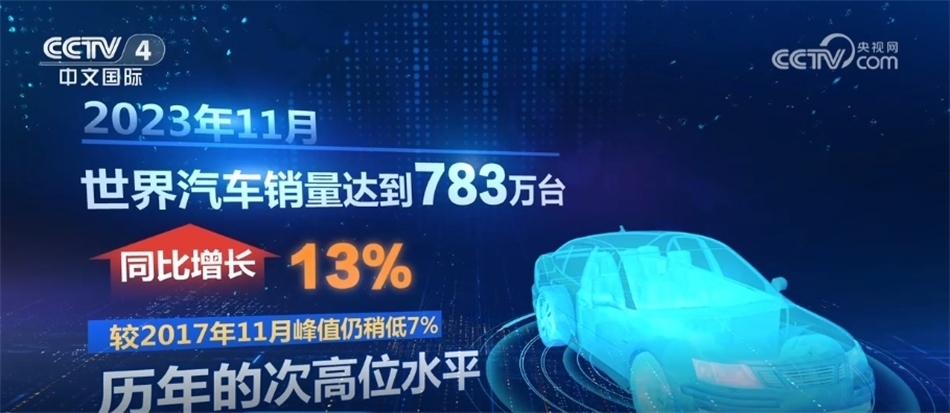 記者同時(shí)從全國(guó)乘用車市場(chǎng)信息聯(lián)席會(huì)了解到,2023年11月,世界汽車銷量達(dá)到783萬臺(tái),同比增長(zhǎng)13%,較2017年11月峰值仍稍低7%,處歷年的次高位水平。其中,中國(guó)車企的銷量占世界份額38%,今年1—11月的累計(jì)份額達(dá)到33%。