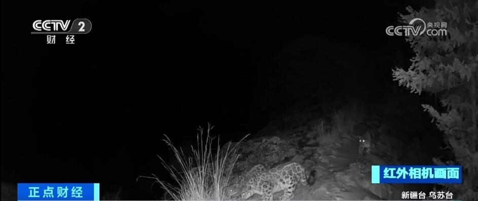 近日,在新疆烏蘇南部山區(qū),紅外相機拍攝到雪豹出沒的影像,而且是三只雪豹同框的身影。畫面中,三只成年雪豹體型健碩,慢悠悠地先后依次經(jīng)過紅外相機,它們在雪地上邊走邊覓食,并不時在草叢中停留。