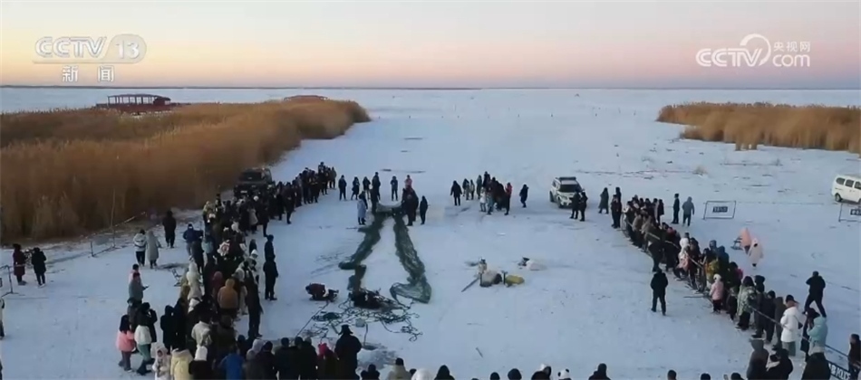 總臺記者? 阮超:我現(xiàn)在是烏梁素海的冰面上,我身邊就是此次冬捕的出魚口。隨著漁網(wǎng)緩緩拉動,水面下的魚被不斷運送到冰面上來。