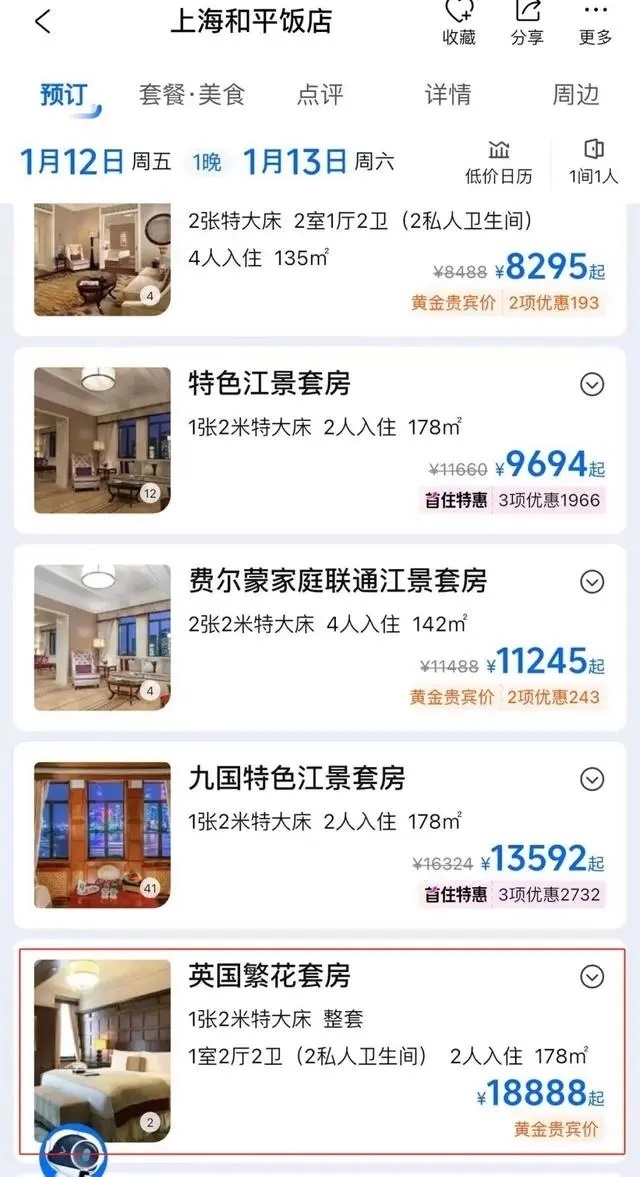 劇中出鏡率極高的和平飯店英國(guó)套房也成了“熱門(mén)產(chǎn)品”。目前,和平飯店英國(guó)套房在旅游平臺(tái)上被命名為“英國(guó)繁花套房”。9日查詢(xún)攜程旅行平臺(tái)發(fā)現(xiàn),9-11日該套房已售罄,12日入住一晚的價(jià)格為18888元。據(jù)媒體此前報(bào)道,這一套房在今年春節(jié)期間含早價(jià)為22888元一晚。