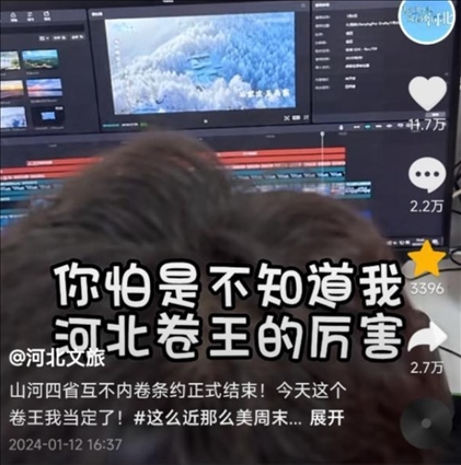 有網(wǎng)友建議賬號(hào)改名為“河北文旅”,“不然都搜不到”,“聽勸”的官方賬號(hào)火速改名,并發(fā)布視頻“宣戰(zhàn)”,“山河四省互不內(nèi)卷?xiàng)l約正式結(jié)束,今天這個(gè)卷王我當(dāng)定了”,于是開始“瘋狂輸出”,日更75條,可還了得?