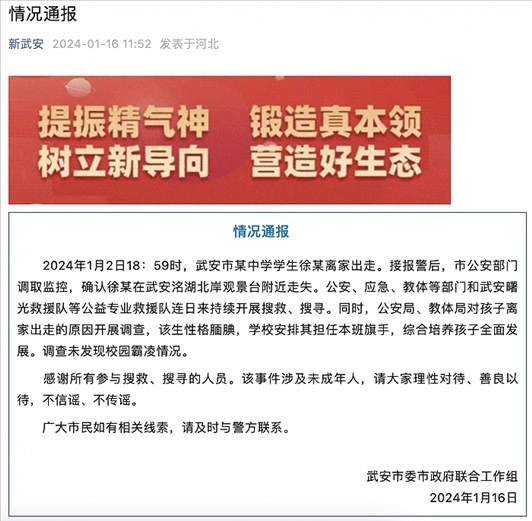 ·河北武安通報(bào)“一高中生失聯(lián)十余日”:未發(fā)現(xiàn)校園霸凌情況。