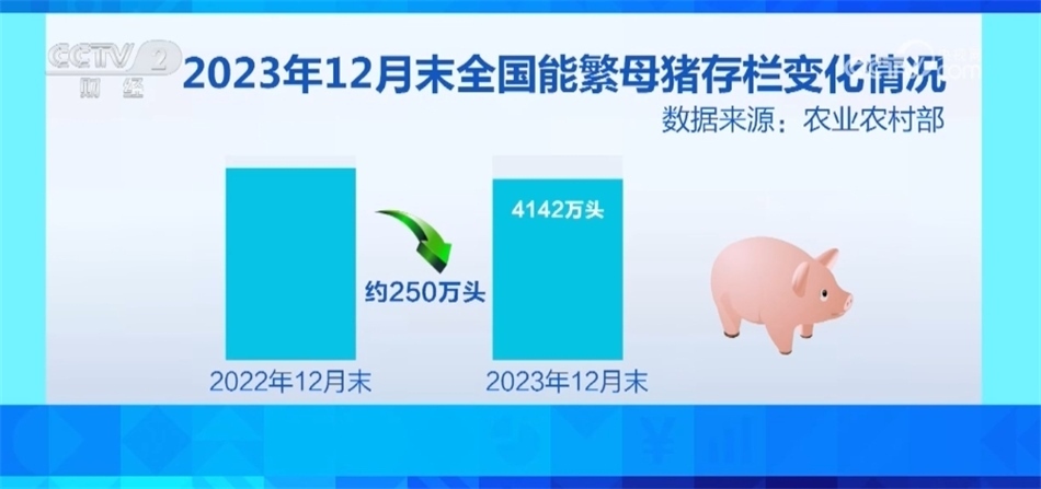針對生豬產(chǎn)能偏高、養(yǎng)殖持續(xù)虧損的問題,農(nóng)業(yè)農(nóng)村部指導(dǎo)各地加強生豬產(chǎn)能調(diào)控,引導(dǎo)養(yǎng)殖場戶適應(yīng)性調(diào)減產(chǎn)能,順時順勢出欄肥豬,加快供需回歸均衡。2023年12月末,全國能繁母豬存欄量4142萬頭,比2022年12月末的階段性高點減少約250萬頭。