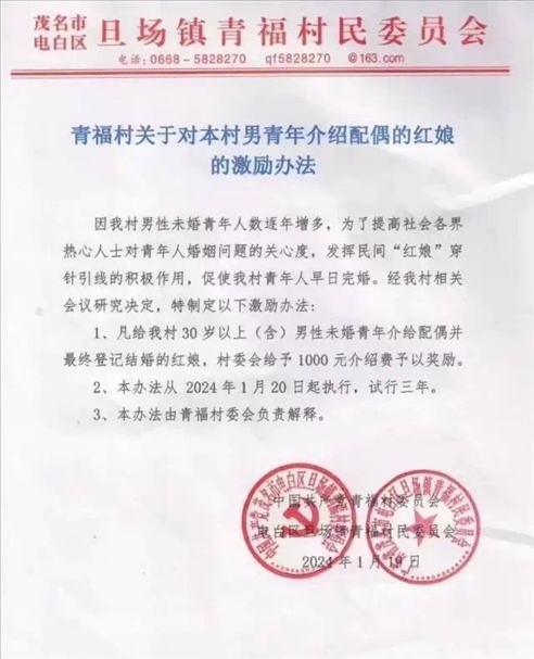 ·廣東茂名一村出臺(tái)紅娘獎(jiǎng)勵(lì)辦法:促成一名男青年結(jié)婚獎(jiǎng)六百至一千。