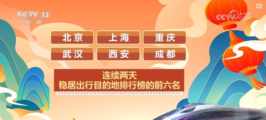 從12306的售票情況看,高峰期1秒鐘就能售出1000多張車(chē)票。北京、上海、重慶、武漢、西安、成都連續(xù)兩天穩(wěn)居出行目的地排行榜的前六名。