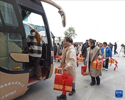 1月28日,在浙江省臺(tái)州市仙居縣,一家企業(yè)的甘肅籍員工登上返鄉(xiāng)過(guò)年專車。新華社發(fā)(王華斌 攝)