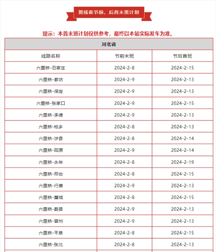北京六里橋客運(yùn)主樞紐春節(jié)運(yùn)營(yíng)安排發(fā)布,具體如下:
