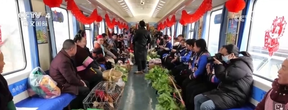 在貴州,有一趟往返于貴陽與玉屏之間的“慢火車”5640次列車,里面專設了一個農特產品車廂。新春臨近,村民們將自家養(yǎng)殖的土雞、雞蛋,熏制的香腸、臘肉,以及水果、蔬菜帶上列車,向旅客現(xiàn)場售賣。