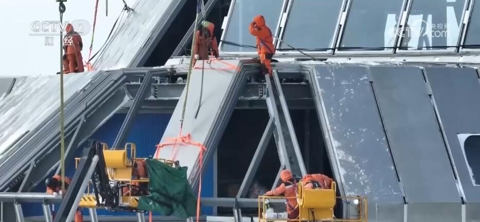 800多斤的幕墻板在大風(fēng)的作用下,就像飄在空中的樹葉,非常難以控制。此時(shí),現(xiàn)場(chǎng)的風(fēng)力已經(jīng)增加到了8級(jí),氣溫驟降。40分鐘之后,在現(xiàn)場(chǎng)所有隊(duì)員的配合下,第一塊板終于穩(wěn)穩(wěn)的就位了。緊接著是第二塊、第三塊。盡管已經(jīng)在風(fēng)雪中奮戰(zhàn)了十幾個(gè)小時(shí),但大家的臉上依然掛滿了微笑。凌晨12點(diǎn)半,最后一塊板終于順利安裝到位,新站迎風(fēng)面實(shí)現(xiàn)了全封閉,大家也終于放心了。