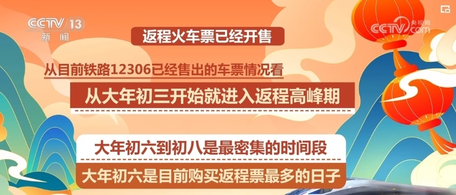 春節(jié)的返程火車票已經(jīng)開售,從目前鐵路12306已經(jīng)售出的車票情況看,從大年初三開始就進(jìn)入大家返程的高峰期,大年初六到初八是最密集的時(shí)間段,其中,大年初六是目前購(gòu)買返程票最多的日子。