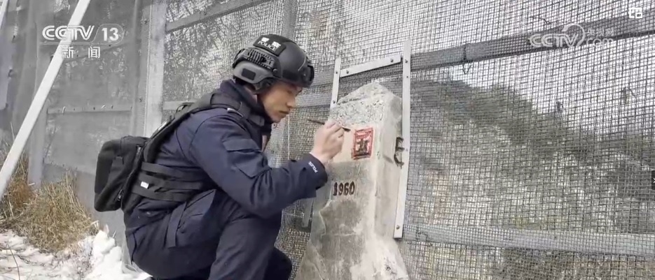 穿戴好裝備,帶上水、自熱米飯等口糧,步行4個小時后,民警們到達了中緬5號界碑。巡邏隊員們熟練地打水、擦拭,將界碑清理干凈,在用筆對界碑上的“中國”沾紅描新。