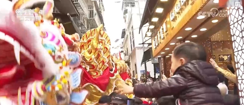 農(nóng)歷春節(jié)大年初一,澳門特區(qū)政府旅游局舉辦“歡樂(lè)春節(jié)——2024年龍騰舞躍賀新春”社區(qū)巡演活動(dòng)。238米長(zhǎng)的大金龍和18頭醒獅,穿越澳門大街小巷和主要景區(qū),市民和游客紛紛伸手觸摸金龍和醒獅,迎春納福。