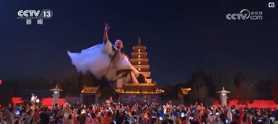 除夕當晚9時,西安分會場《山河詩長安》篇章的“打開方式”讓人眼前一亮。在科技助力下,“詩仙”李白跨越歲月長河“穿越”而來,在煙火璀璨中,隨著熙熙攘攘的人群一起走進西安城墻永寧門,走入千年后的耀眼長安。