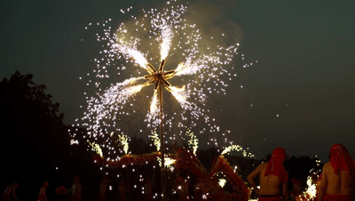 引龍出洞(火流星表演):舞龍人把燒紅的木炭放入小鐵籠中,系在長繩一端,他手握長繩,飛快地?fù)]動(dòng)繩子,使鐵籠和木炭在空中飛轉(zhuǎn),流光溢彩,讓人挪不開眼。