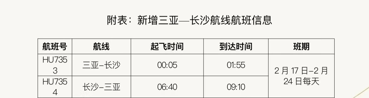 據悉,在民航局、海南省交通廳的支持下,海南航空積極協(xié)調申請加班計劃。2月17日至24日期間,海南航空每日新增三亞—長沙往返航班。去程航班HU7353,從三亞起飛時間為凌晨 00:05,到達長沙黃花國際機場時間為01:55;返程航班HU7354,從長沙起飛時間為06:40,到達三亞鳳凰國際機場時間為09:10,以上航班信息以實際查詢?yōu)闇省B每涂赏ㄟ^海南航空官網及APP、微信公眾號及小程序、服務熱線95339、各直屬售票處及授權代理購買機票。