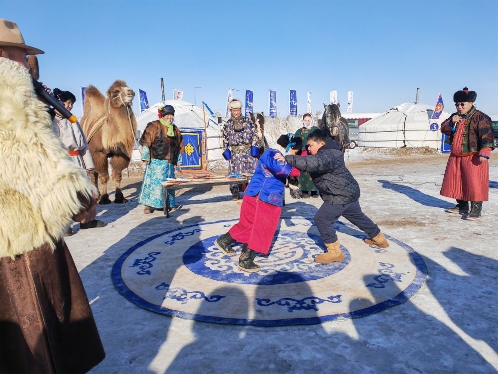 為迎接“十四冬”,呼倫貝爾推出了豐富多彩的文化活動和產(chǎn)品。陳巴爾虎旗的牧民巴圖蘇和與合伙人在莫爾格勒河景區(qū)推出“天天冰雪那達慕”活動,設(shè)雪地搏克、騎馬射箭、“冰地嘎拉哈”、駱駝爬犁等項目,讓游客沉浸式體驗蒙古族文化與傳統(tǒng)運動。首次嘗試雪地搏克的河北固安游客張瑞堂,與一位蒙古族少年友好競技,他的姐姐則用手機記錄下了這段珍貴的經(jīng)歷。