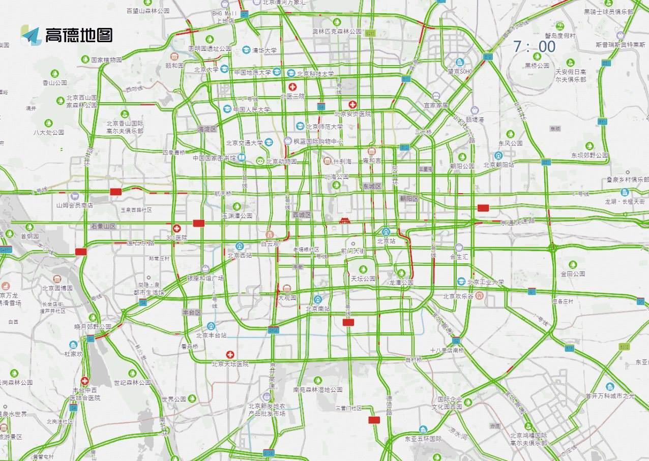 ? ? ? ?工作日白天時段,預(yù)計兒童醫(yī)院、兒研所、北京醫(yī)院、西苑醫(yī)院、復(fù)興醫(yī)院、北醫(yī)三院、同仁醫(yī)院、積水潭醫(yī)院等醫(yī)院門前及周邊道路車流量較大,高峰時段為7至13時。