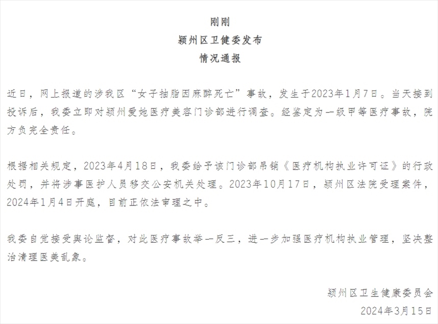 ·安徽阜陽一女子抽脂因麻醉死亡,官方通報(bào)。