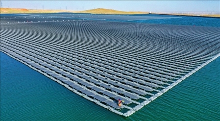 位于寧夏靈武市的國家能源集團(tuán)寧夏電力公司寧東電廠3×5.98兆瓦漂浮分布式光伏發(fā)電項(xiàng)目(2022年6月17日攝)王鵬攝/本刊