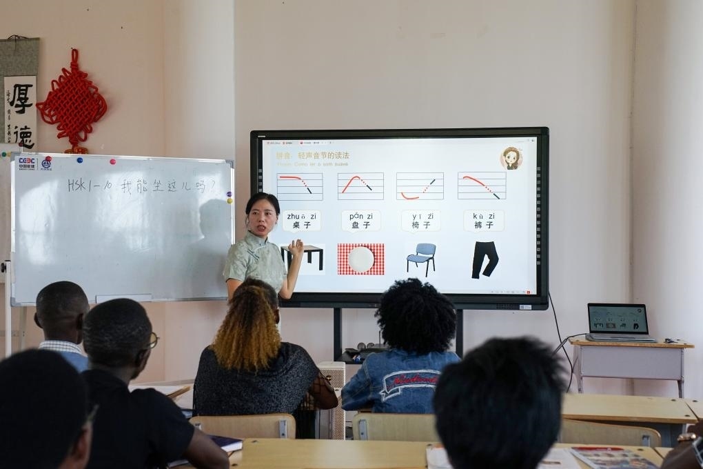 在安哥拉首都羅安達,內(nèi)圖大學(xué)孔子學(xué)院教師正為學(xué)生們講授中文。