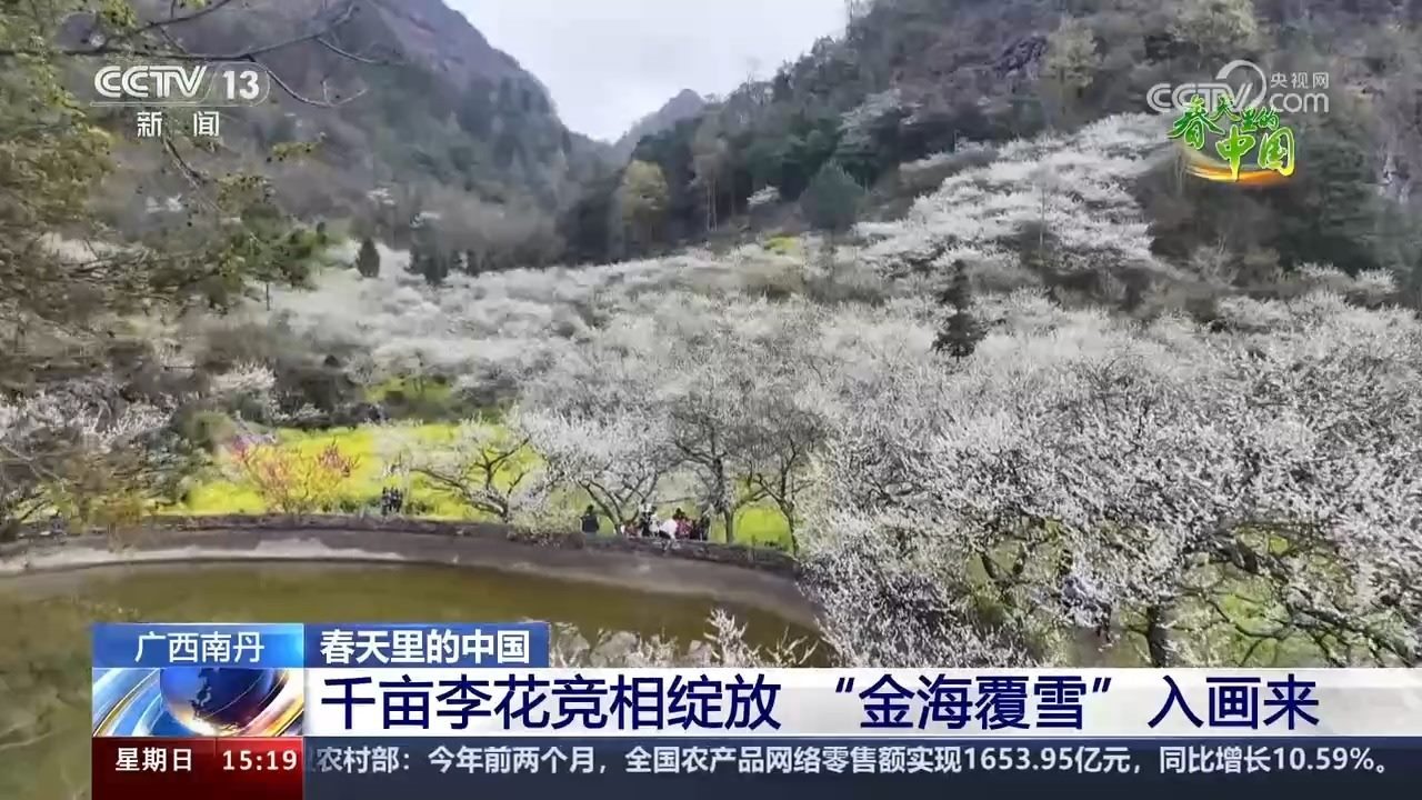 春風(fēng)送暖三月天,李花滿山澗。跟隨鏡頭,我們來到廣西河池市南丹縣的城關(guān)鎮(zhèn)。眼下,千畝李花競相綻放,一簌簌雪白的李花綴滿枝頭,潔白淡雅。漫山李花與金燦燦的油菜花交相輝映,宛如“金海覆雪”,一幅美麗的鄉(xiāng)村春日畫卷徐徐展開。游客紛至沓來,三五成群穿梭其間,或漫步花海,或拍照留影,盡情享受美好春光。