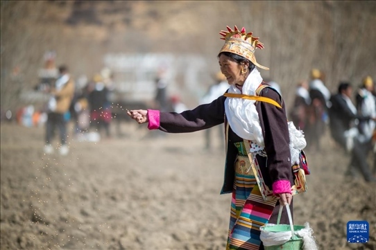 3月16日,在西藏山南市瓊結縣加麻鄉(xiāng)加麻村的春耕儀式現(xiàn)場,農(nóng)民播撒種子。新華社記者 旦增尼瑪曲珠 攝