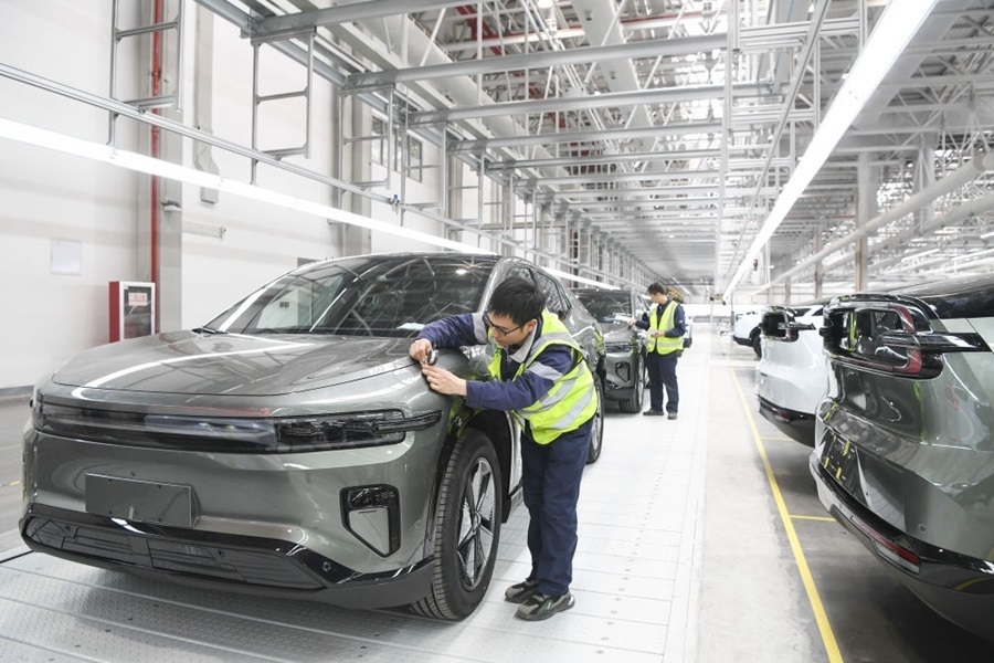 2024年3月14日,工作人員在長安汽車重慶渝北新工廠總裝車間進(jìn)行整車下線前的檢查。新華社記者 王全超 攝