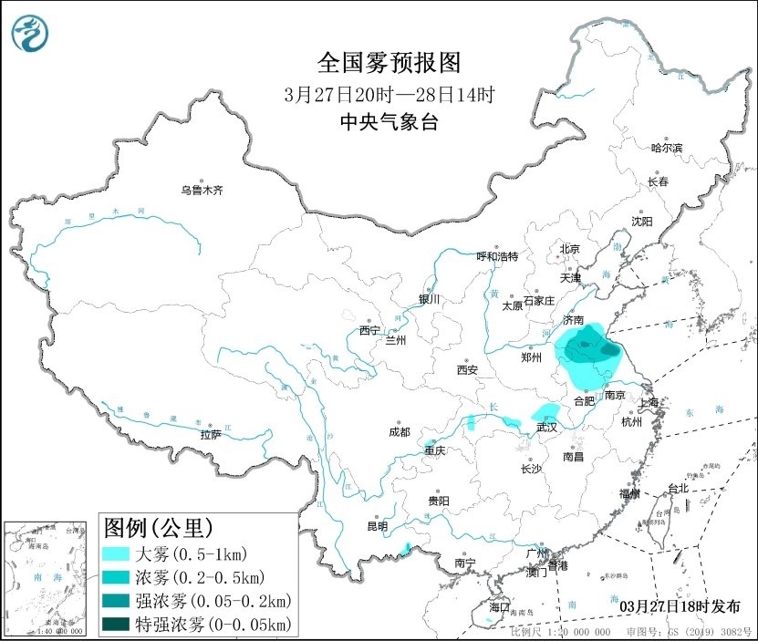 央視網(wǎng)消息:中央氣象臺3月27日18時發(fā)布大霧黃色預(yù)警:預(yù)計,3月27日夜間至28日上午,山東南部、河南東部、安徽中北部、江蘇中北部、湖北東部和南部等地的部分地區(qū)有大霧,其中,山東南部、安徽北部、江蘇北部等地的部分地區(qū)有能見度低于500米的濃霧,局地有能見度低于200米的強(qiáng)濃霧。
