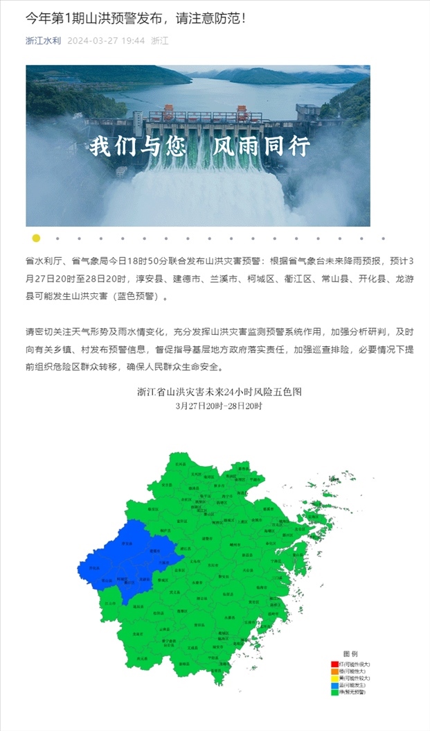 央視網(wǎng)消息:據(jù)“浙江水利”公眾號(hào)消息,浙江省水利廳、浙江省氣象局今日18時(shí)50分聯(lián)合發(fā)布山洪災(zāi)害預(yù)警:根據(jù)省氣象臺(tái)未來降雨預(yù)報(bào),預(yù)計(jì)3月27日20時(shí)至28日20時(shí),淳安縣、建德市、蘭溪市、柯城區(qū)、衢江區(qū)、常山縣、開化縣、龍游縣可能發(fā)生山洪災(zāi)害(藍(lán)色預(yù)警)。
