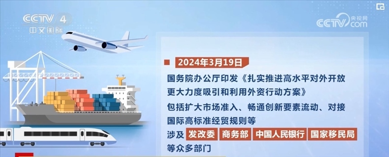2024年3月19日,國務院辦公廳印發(fā)《扎實推進高水平對外開放 更大力度吸引和利用外資行動方案》,包括擴大市場準入、暢通創(chuàng)新要素流動、對接國際高標準經貿規(guī)則等,涉及國家發(fā)展改革委、商務部、中國人民銀行、國家移民局等眾多部門。