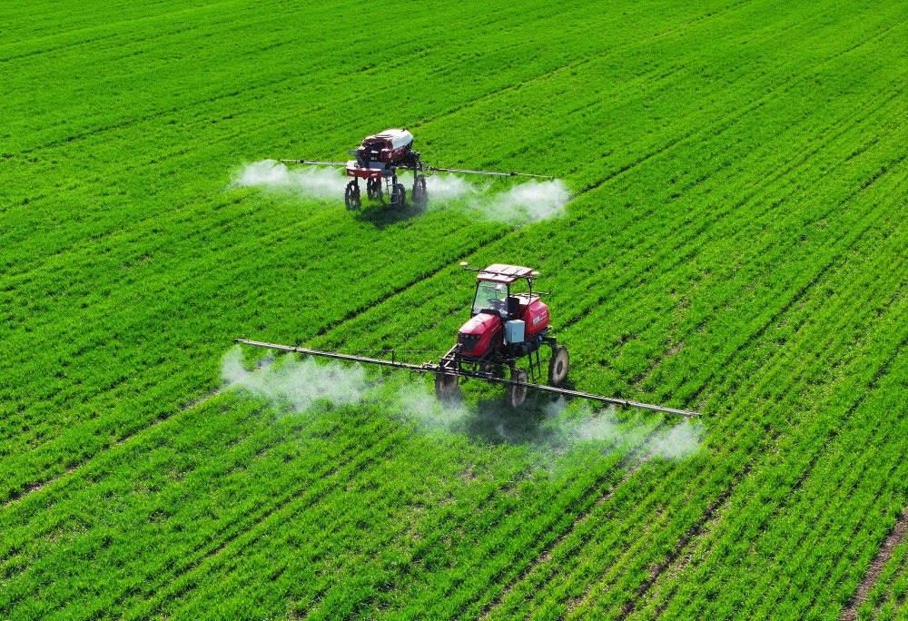 2024年3月13日,在安徽省蚌埠市五河縣頭鋪鎮(zhèn),農(nóng)民駕駛農(nóng)機給小麥噴灑農(nóng)藥。新華社記者 黃博涵 攝