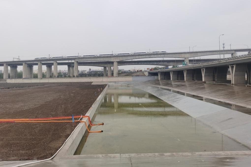 永定河京港澳高速公路大橋南,大寧調(diào)蓄水庫水毀修復工程施工現(xiàn)場,記者看到,新建的消力池已經(jīng)建好,所有實體工程已經(jīng)完工,一些工人正在做收尾清理工作。