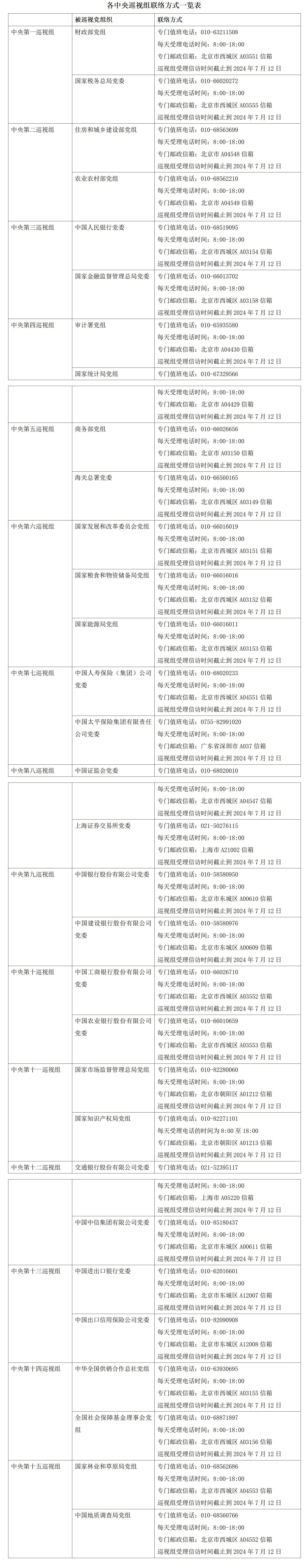 根據(jù)黨中央關于巡視工作統(tǒng)一部署,二十屆中央第三輪巡視的15個巡視組陸續(xù)開始進駐被巡視單位。目前,中央巡視組已進駐31家單位并公布了聯(lián)系方式。據(jù)了解,中央巡視組將在被巡視黨組織工作3個月左右。